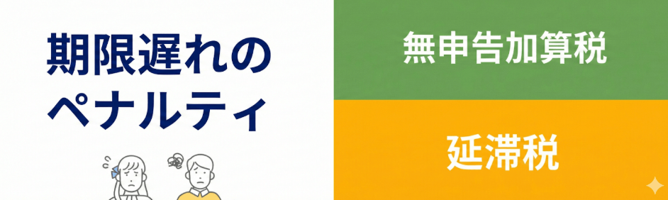 また、納税額を納付期限までに納めなかった場合、延滞税が課されます。延滞税は、納税が遅れた日数に応じて加算され、年率最高14.6%(※)で計算されます。(※実際の税率は、その年の「延滞税特例基準割合」に応じて軽減されるため、これより低くなるのが一般的です。)