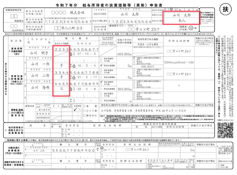 「《記載例》令和7年分扶養控除等申告」を加工して作成