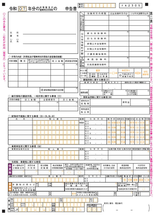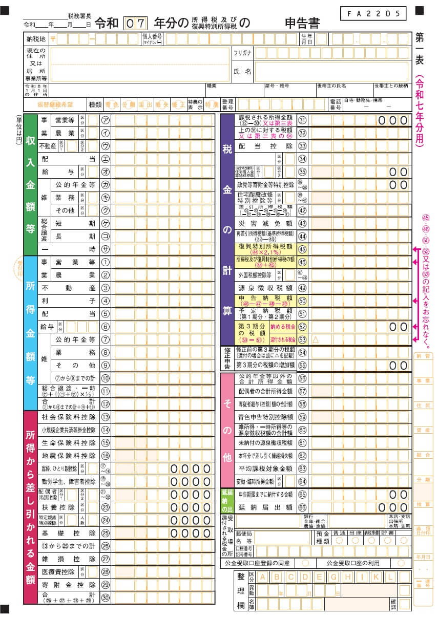 引用:確定申告書等の様式・手引き等(令和7年分の所得税及び復興特別所得税の確定申告分)|国税庁、確定申告書(第一表及び第二表)」