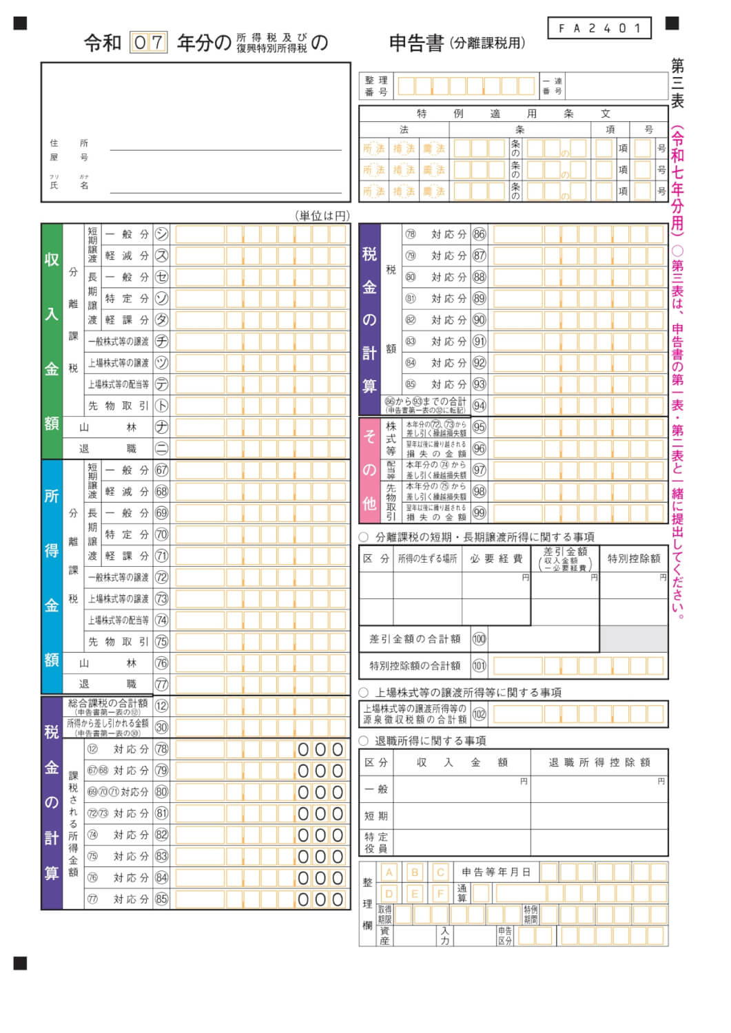 申告分離課税の申告書(申告書第三表 分離課税用)